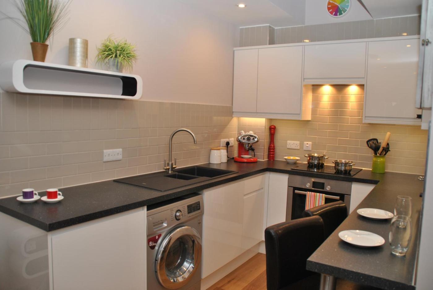 One-Bedroom Apartment. This newly refurbished ground-floor apartment has private access and storage space for luggage, bicycles and other belongings. The apartment has an open-plan living area with seating and dining table. It is fitted with a fully equipped kitchen and a washing machine. It includes a bathroom with a shower over a tub. There is private off-road parking and free WiFi. Windsor town centre is just a 3-minute walk from the property. Please note maximum occupancy is 2 adults. Children cannot be accommodated at the property. ;